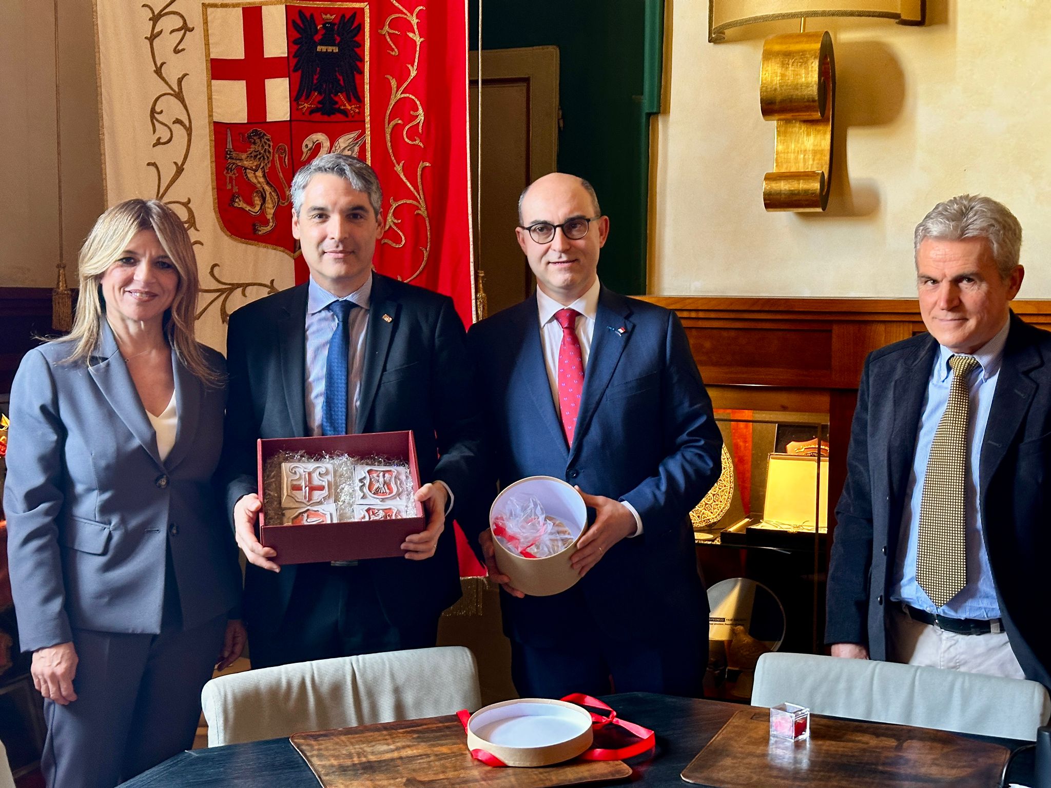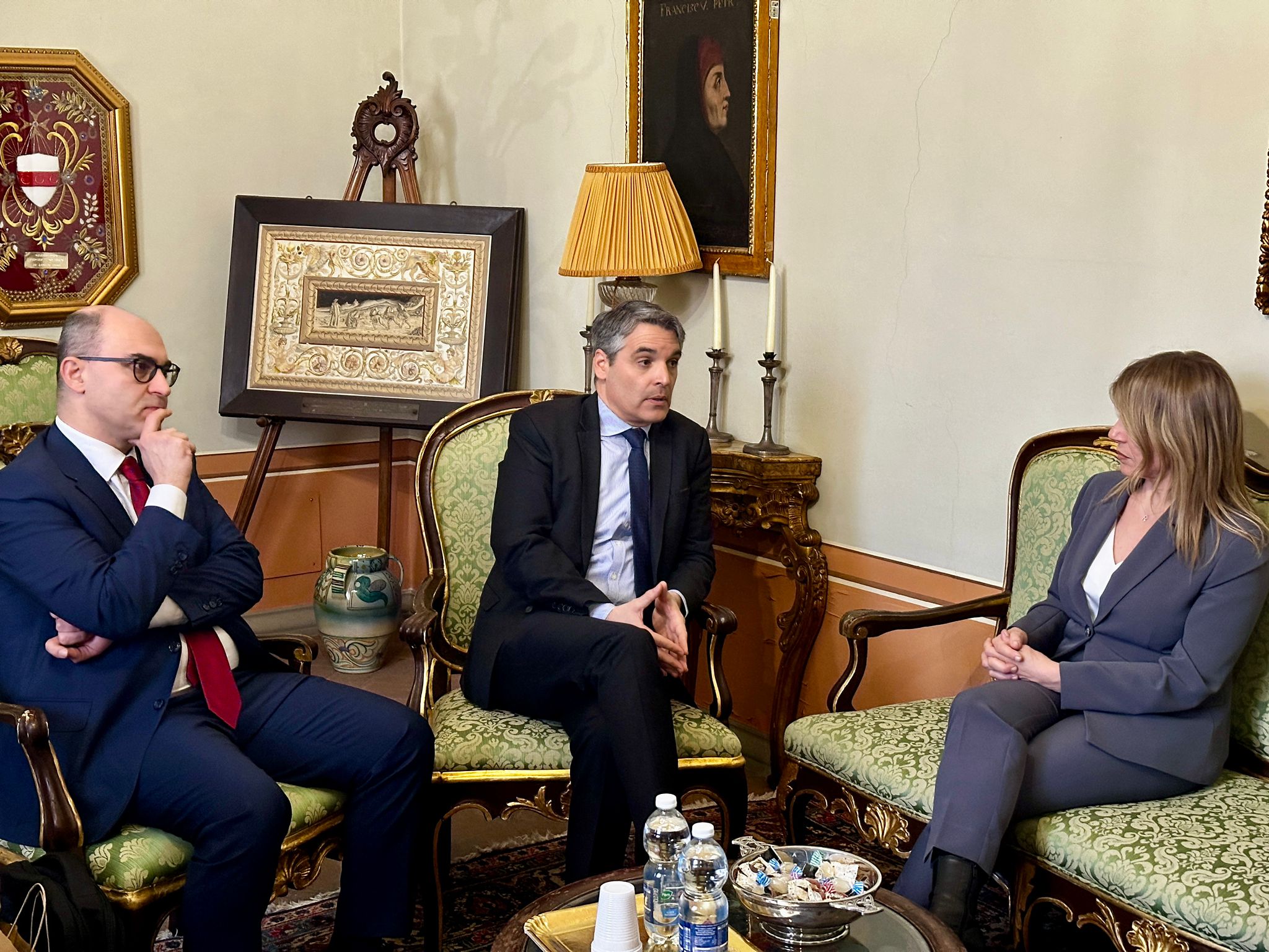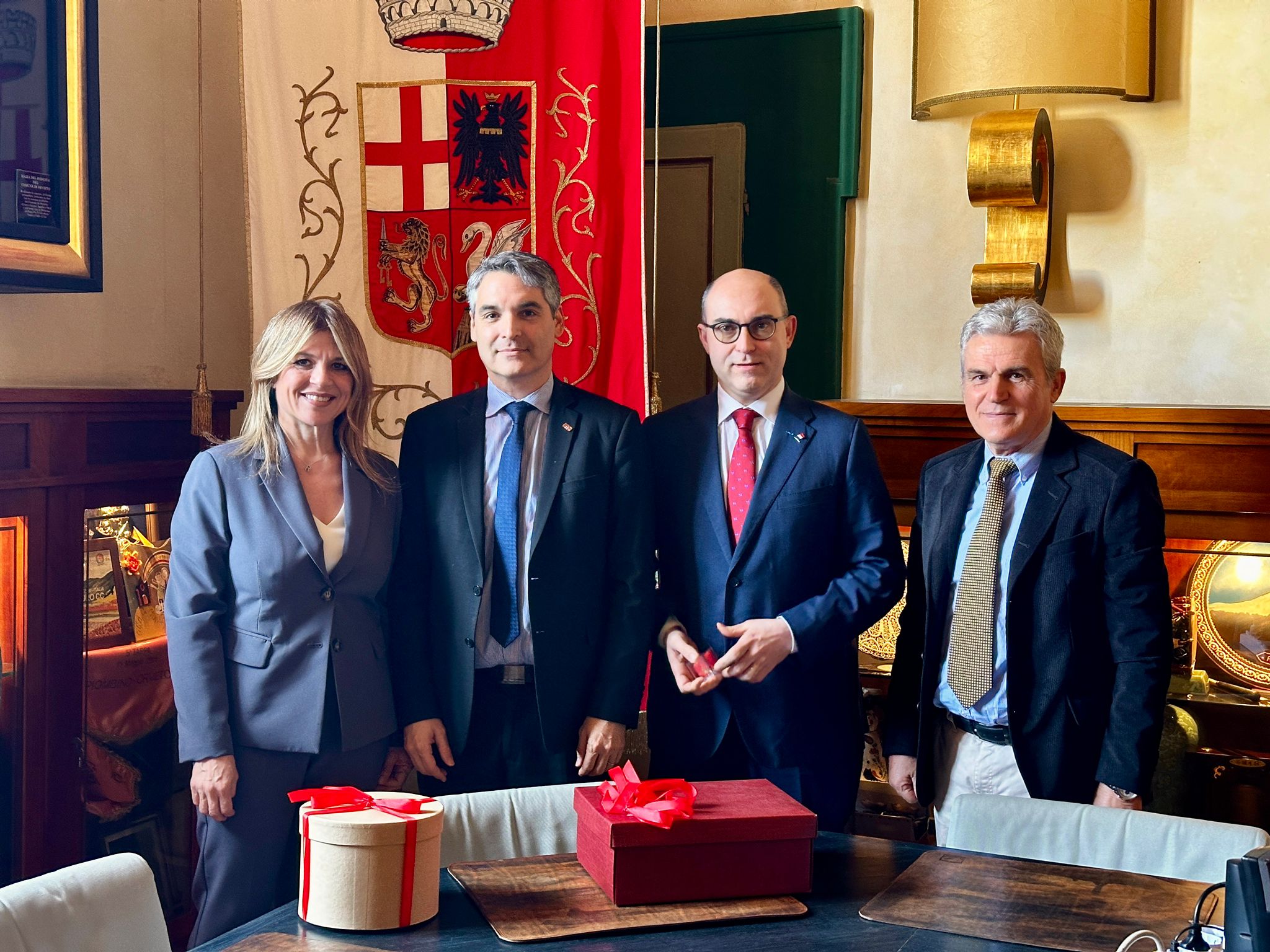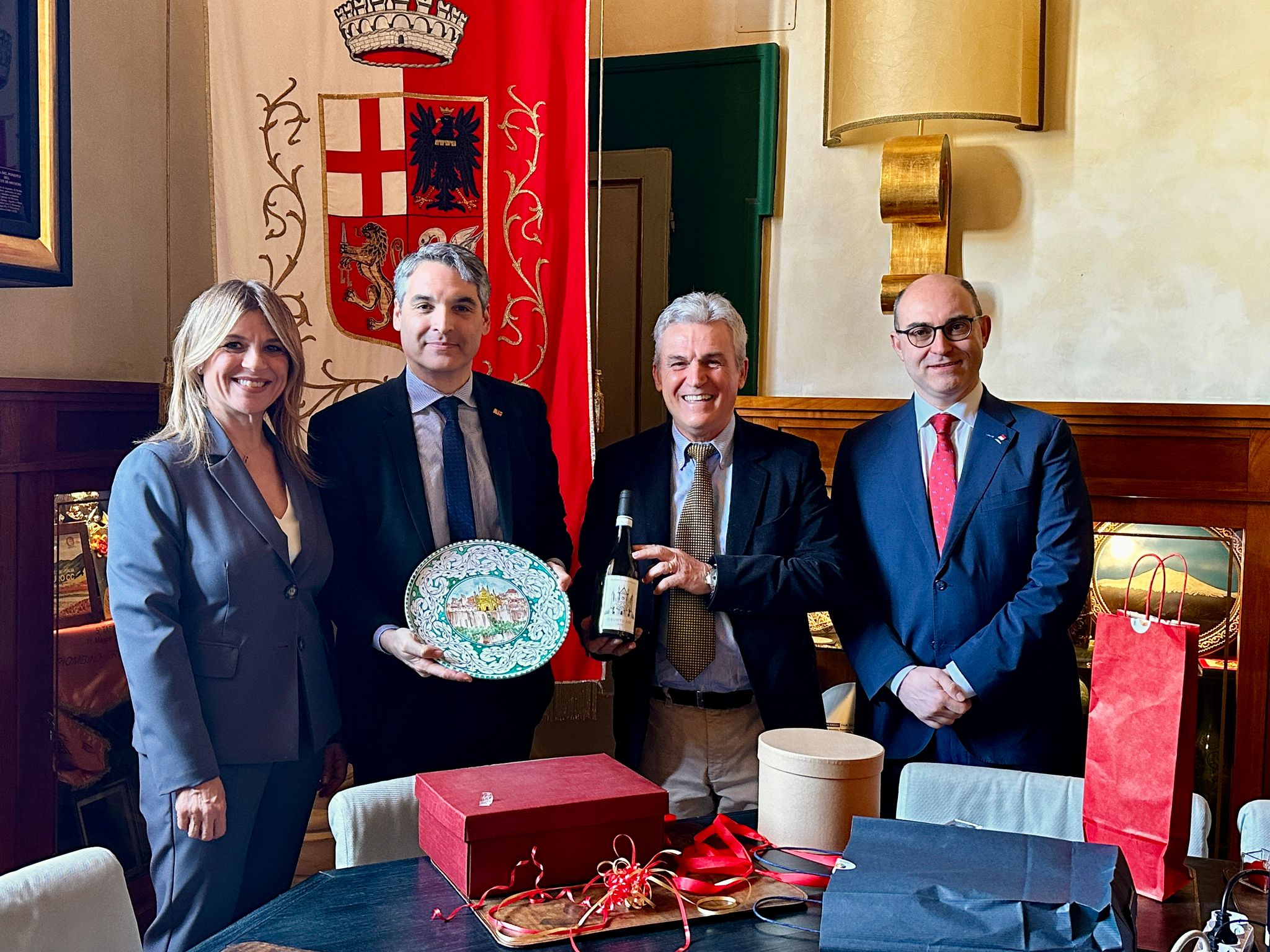 (COMUNICAZIONE) ORVIETO – Il sindaco di Orvieto, Roberta Tardani, ha ricevuto nella mattina di giovedì 14 marzo, la visita del Console generale di Francia a Roma, Fabrice Maiolino, accompagnato dal Console onorario di Francia in Umbria, Gabriele Galatioto. Presenti all’incontro anche il presidente del Consorzio tutela dei vini di Orvieto, Vincenzo Cecci, insieme ad alcuni membri del consiglio di amministrazione, e il presidente del Gal Trasimeno Orvietano, Gionni Moscetti.