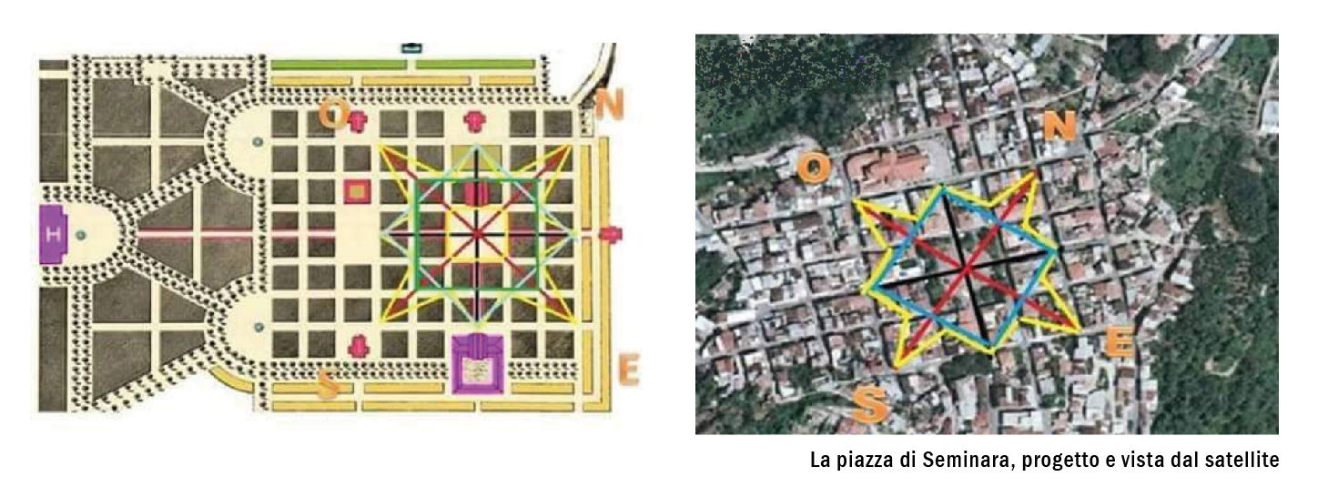 Osservando il progetto della Città di Seminara i punti cardinali rappresentati dalle quattro fontane dei tritoni e le 4 strade centrali che portano al centro della piazza formano una stella a otto punte.
